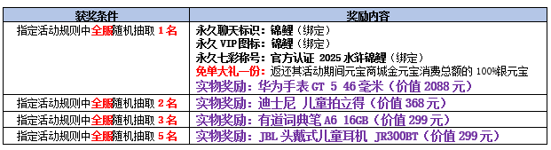 活动规则:活动期间参与水仙精灵的秘宝并开启大宝箱的角色,有机会获得馈赠奖励。