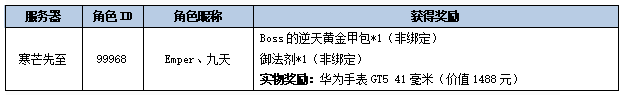 恭喜以下角色获得:Boss的逆天黄金甲包*1(非绑定)、御法剂*1(非绑定)、华为手表GT5 41毫米(价值1488元)