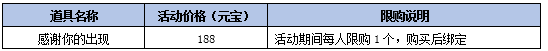 感谢你的出现:感谢你的出现,让我期待永远。右键使用后获得绑定的金盏花束或水仙花束*1、刻刀*1,并有几率额外获得非绑定的装饰家具:甜品烘焙机或烤箱*1。