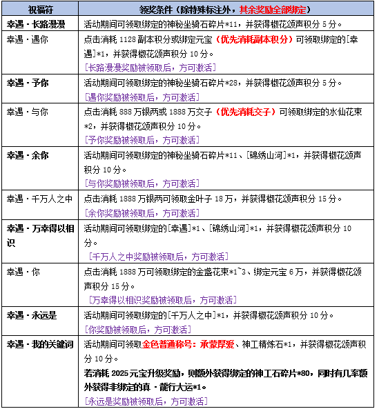 本期[幸遇]活动列表:每个祝福符仅可领奖1次,且需从右至左按顺序依次领取。