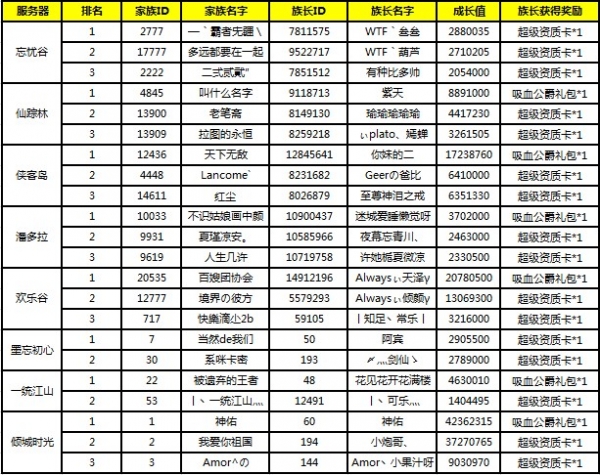 b) 每个服务器位列家族成长值up排行榜第二、三名且up值≥100万的家族族长获得:超级资质卡*1(非绑定)。