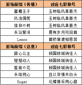 本次返场前缀为自主五选一,可选择范围如下:(选择前缀后对应获得七彩称号)
