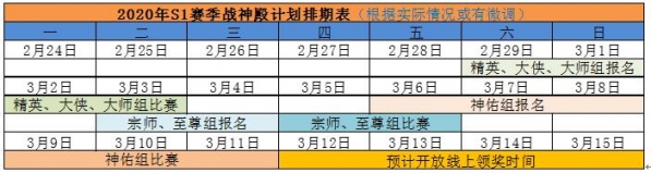 2020年S1赛季战神殿预计于2月29日再次点燃荣誉的战火,计划排期表如下:(以实际公告为准)