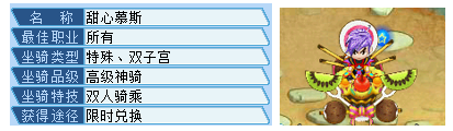 限定坐骑包I:随机获得沙滩椅、露娜、骷髅号、垂耳兔、神行灵鼠、灵貂花鼓、地狱战骑、超能兔、高级推进器、甜心慕斯、游园艇等其中一个坐骑礼包。