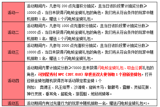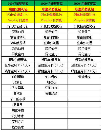 活动规则:活动期间内,前往活动NPC礼物使者处可参与充值积分抽奖活动。充值积分抽奖分为200点抽奖、1000点抽奖和2000点抽奖三个档次。