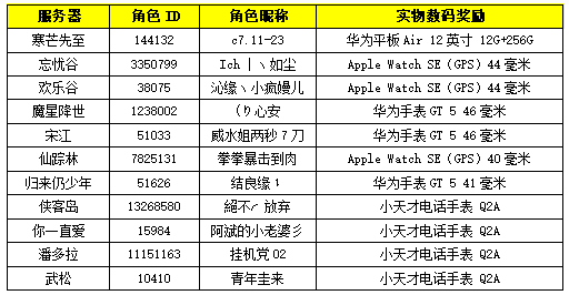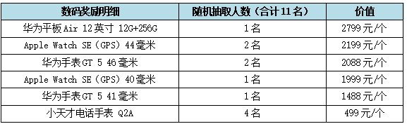 活动期间全部服务器完成椒花颂声[盛世]耀吾辈之中华任务获得红色普通称号:这盛世如您所愿的所有角色中,随机抽取11名,每人赠送实物数码奖励一个,总价值约16888元。