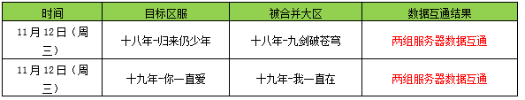为了提供更好的游戏环境,11月12日7:00-12:00将对大区【十八年】、【十九年】下的服务器分别进行数据互通操作,详情如下:
