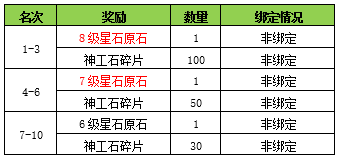 | 累计获得3V3跨服比武分数≥300 | 不限量 | 6级铭石原石*1 | |