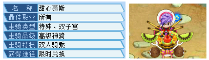 限定坐骑包I:随机获得沙滩椅、露娜、骷髅号、垂耳兔、神行灵鼠、灵貂花鼓、地狱战骑、超能兔、高级推进器、甜心慕斯、游园艇等其中一个坐骑礼包。