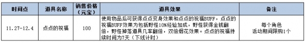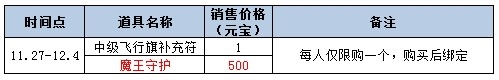1. 限时上架元宝道具 “魔王守护(特)”、“中级飞行旗补充符·特”、“点点的祝福”,上架时间:2019年11月27日9:00--12月4日7:00。