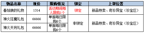 2. 限时上架 “春姑娘的礼物”、“神火狂魔礼包” 、“神火天将礼包”。上架时间:2020年4月1日-2020年4月8日版本更新前。