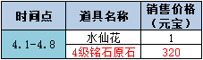 1. 限时上架“水仙花”、“4级铭石原石”,上架时间:2020年4月1日更新后至2020年4月8日版本更新前。(心动券、新•心动券不下架)