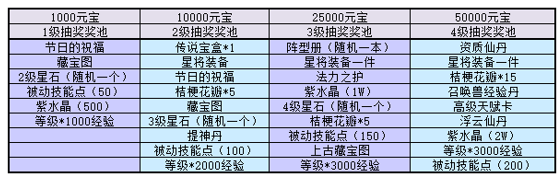 每天累积消费一定数量的元宝可以进行抽奖。按照消费情况分为四等抽奖宝箱,不同等级的宝箱中的奖励不同。每天每个宝箱只能抽一次。