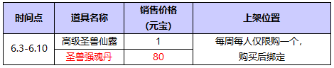1. 限时上架“高级圣兽仙露、“圣兽强魂丹”,上架时间:2020年6月3日更新后至2020年6月10日版本更新前。