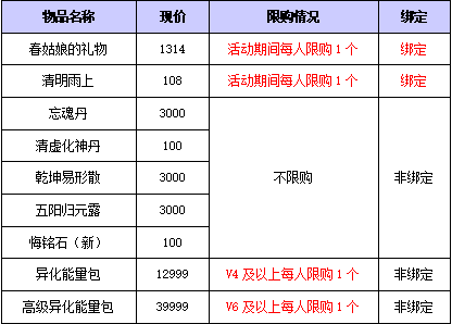 2. 限时上架或打折道具 “春姑娘的礼物”、“清明雨上”、“忘魂丹”、“清虚化神丹”、“乾坤易形散”、“五阳归元露”、“悔铭石(新)”、“异化能量包”、“高级异化能量包”等物品,上架时间:2022年3月30日更新后至2022年4月6日版本更新前。