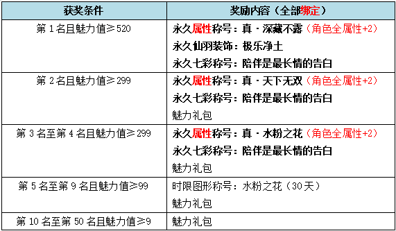 本期魅力榜活动奖励:(全部绑定,若魅力值不符合名次对应条件,则不可以获得任何奖励哦!)