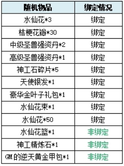 魅力礼包:水浒有你·魅力榜第2名~第50名魅力礼包,使用后必得绿色普通称号:水浒有你和水仙花束*1,并有几率额外获得神工精炼石、水仙花篮、银元宝5200、星灵仙丹、水仙花束、坐骑瞬升丸、神工石碎片、桔梗花瓣、特效提神丹等之一,全部绑定。