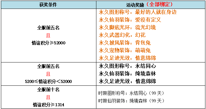 活动规则:活动期间接受好友赠送999朵玫瑰、情书即记录接受者情谊积分(1个999朵玫瑰=100分、1个情书=10分),截至活动结束时达到指定名次且积分符合条件的角色可获得限定奖励。若出现并列情况,则最先达到的获得奖励。若时间相同,则随机一名获得奖励。