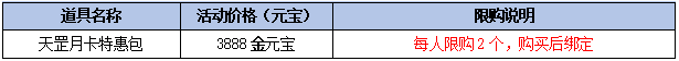 天罡月卡特惠包:购买立得神工石碎片*50,使用30天天罡月卡后每日可领取绑定的水仙花*1、副本积分*20,并激活其他天罡月卡特权。