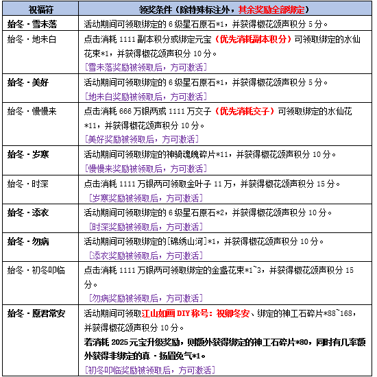 本期[始冬]活动列表:每个祝福符仅可领奖1次,且需从右至左按顺序依次领取。