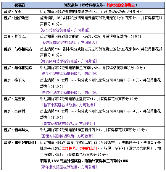 本期[暮岁]活动列表:每个祝福符仅可领奖1次,且需从右至左按顺序依次领取。