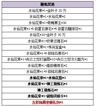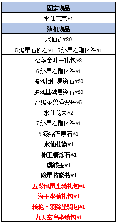 九天之颂·启新岁:福新新岁,运满华年。右键使用后100%获得水仙花束*1,随机获得九天玄鸟坐骑包、海王坐骑礼包、转轮·羽弥坐骑包、五彩凤凰坐骑礼包、魔星技能书、虔诚玉、神工精炼石、水仙花篮等其中一份给力物品,全部非绑定。