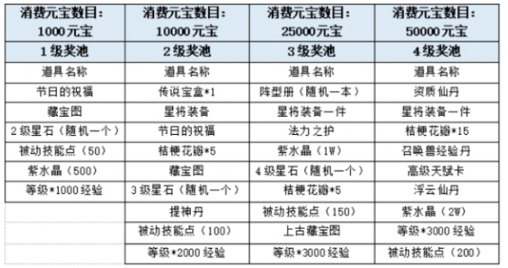 活动规则:每天在元宝商城累积消费一定数量的金元宝可以进行抽奖。按照消费情况分为四等抽奖宝箱,不同等级的宝箱中的奖励不同。活动期间每天每个宝箱只能抽奖一次。