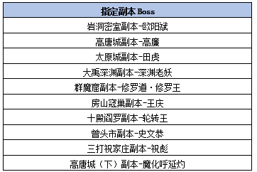 指定副本Boss包括:岩洞密室副本-欧阳斌、高唐城副本-高廉、太原城副本-田虎、大禹深渊副本-深渊老妖、群魔窟副本-修罗道·修罗王、房山寇巢副本-王庆、十殿阎罗副本-轮转王、曾头市副本-史文恭、三打祝家庄副本-祝彪、高唐城(下)副本-魔化呼延灼。