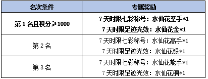 活动规则:活动期间消耗非绑定的指定道具参与彩色糖果幽径可获得水仙花排行榜活动积分,每日积分排名前500名的角色可以进行抽奖,前三名可以获得水仙花排行榜专属时限足迹、七彩称号,第一名还可获得当日珍贵大礼!活动结束后本期水仙花排行榜活动积分将清零。