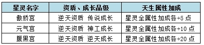 随机星灵包括:传说资质传说成长、传说资质神工成长、传说资质逆天成长、神工资质传说成长、神工资质神工成长、神工资质逆天成长、逆天资质传说成长、逆天资质神工成长、逆天资质逆天成长,绑定情况随机。