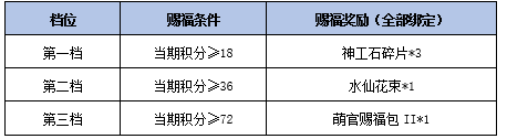 活动规则:积分统计时间内,消耗非绑定水仙花、水仙花束、水仙花篮、水仙花环参与彩色糖果幽径可获得对应水仙花积分,当活动期间累积水仙花积分达到指定条件时,可领取赐福奖励,每档每个角色可领取一次,全部绑定。