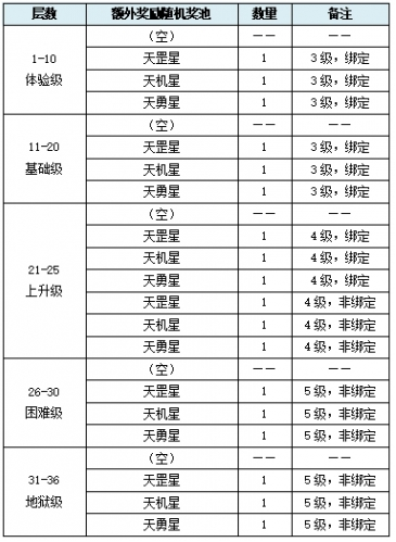 2)额外奖励:首次通关指定层数时有几率额外获得对应随机奖池中的其一奖励。