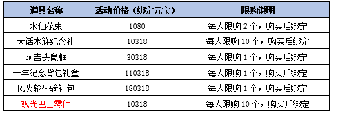 大话水浒纪念礼:梦回大话水浒,右键使用后有几率获得周年限定纪念道具:真·阿吉召唤兽+装饰家具:阿吉·剑/阿吉·浪、首领召唤丹+周年庆水水/浒浒变身、神工精炼石、资质仙丹、圣兽忘魂丹、洗兽药、VIP美发仙丹、水仙花束、圣兽强魂丹*10、高级圣兽强资丹*2、中级圣兽强资丹*4、初级圣兽强资丹*10等之一,除召唤兽/装饰家具/首领召唤丹/变身道具外,其余全部绑定。每次开启礼包需消耗108副本积分。请在购买后7天内开启使用。