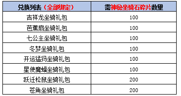 随机坐骑包括:吉祥龙坐骑礼包、冬梦坐骑礼包、神行灵鼠坐骑礼包、高级推进器礼包、官府战马坐骑礼包、绿林战马坐骑礼包、夏梦坐骑礼包、骷髅号坐骑礼包、五彩凤凰坐骑礼包,绑定情况随机。