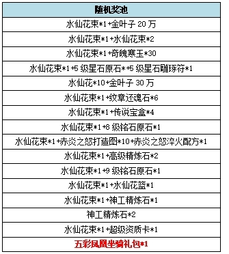 周年快乐:祝水粉们,周年快乐!开启后必得水仙花束*1,并有几率额外获得强心丹*2、高效提神丹、精致的糖果盒、生命之护、法力之护、坐骑瞬升丸、豪华金叶子礼包、水仙花束、周年中骑自选包等之一,全部绑定。