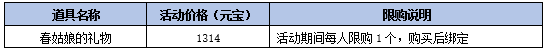 春姑娘的礼物:包含[粉红蓓蕾]14天时限仙羽外观*1、天使银发*1、刻刀*1、水仙花束*1、完美经验丹*20,以上道具全部绑定,同时有几率额外获得非绑定家具一件,鲜花为你开,好运为你来!礼包自购买后14天内有效。